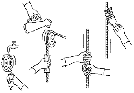 钢丝绳润滑剂的涂加方法大致包括滴加、倾倒、擦拭、涂抹、喷涂、油浴、自动擦拭加脂器等多种方式,润滑剂应该在滑轮组或滚筒的上方加入,此时绳股有屈张,注意循环工作的绳索上均应被涂加,而且绳索应该缓慢弯曲经过滑轮组或滚筒,确保润滑剂在绳索内的渗透,下图为常见的四种方式,由左至右分别为滴加、倾倒、擦拭、涂抹。