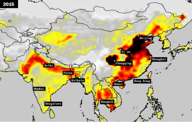 分析师看美国宇航局NASA的卫星图像,发现颗粒物测量——微观粒子侵入肺部,可导致癌症和心脏病,在中国过去几年,印度的空气质量已经恶化,2015是印度污染最严重的创纪录的一年。