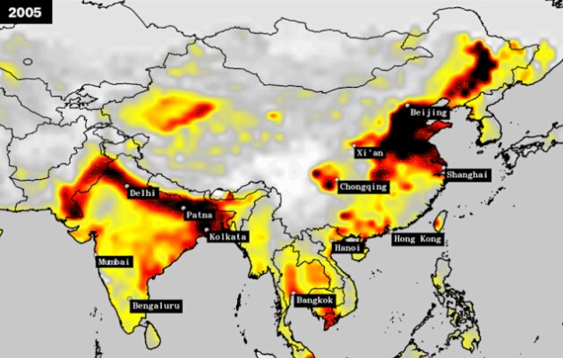 绿色和平组织发现第一次,印度公民平均暴露在颗粒空气中比一般的中国人的颗粒物中要多。来自绿色和平组织的图片显示,2005年到2015年中国的空气质量是先变坏,再改善趋好,而印度的空气质量一直在恶化: