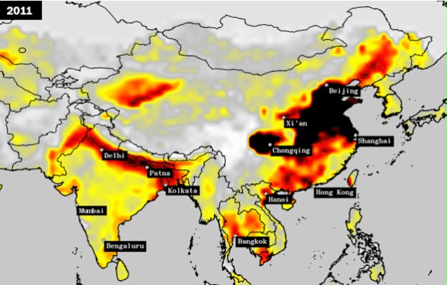 分析师看美国宇航局NASA的卫星图像,发现颗粒物测量——微观粒子侵入肺部,可导致癌症和心脏病,在中国过去几年,印度的空气质量已经恶化,2015是印度污染最严重的创纪录的一年。