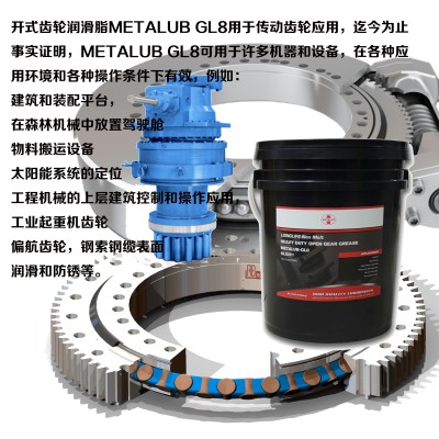 长寿命开式齿轮润滑脂GL8是一个专门为重负荷工作状况下的开式齿轮,绳索和滑动面而定制的特种合成润滑油脂。长寿命开式齿轮润滑脂GL8由二硫化钼,石墨和特殊添加剂精心调制而成。长寿命开式齿轮润滑脂GL8在齿轮齿和滑动面的压力搓揉工作状况下,二硫化钼沉积在金属表面形成一个能承受冲击负荷的润滑膜,并且有优异的防水性能。