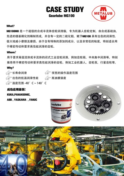 长寿命齿轮润滑脂MG100用于要求高级流体或半流体的工业齿轮润滑,例如齿轮箱,中央集中润滑等,特别推荐用于机器人等精密传动和要求高性能润滑的齿轮。